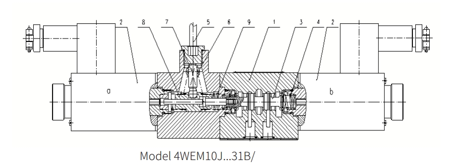 Quando não há energia, o carretel da válvula (3) está na posição neutra ou original sob a ação da mola de retorno. Quando a força do solenóide (2) atua na bobina da válvula (3), ela é empurrada da posição de restante para a posição terminal. Dessa maneira, o óleo de pressão é realizado de P a A e B a T, ou de P a B e de A a T. Depois que o solenóide (2) é desligado, a mola de retorno (4) retorna o carretel da válvula (3) à sua posição original.
